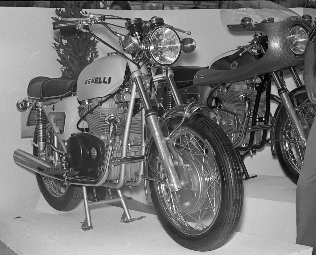 Benelli fait de belles ventes aux États-Unis dans les années 60 et son importateur Cosmopolitan Motors à Philadelphie pousse l’usine de Pesaro à étudier un modèle de plus grosse cylindrée. Benelli conçoit donc un bicylindre presque vertical de 650 cm3 à soupapes culbutées. Cylindres et culasses sont totalement séparés, les cotes sont super carrées (85 x 58 mm) et il y a un démarreur électrique. Ce bloc très compact est hâtivement monté pour le salon de Milan 1967 avec un bel ensemble cadre double berceau et habillage polyester qui semble sorti tout droit de chez Rickman Métisse… en original ou copie conforme ? Nul ne sait. La belle est chaussée en 18 pouces, freinée par l’immuable Grimeca et alimentée par un seul Dell’Orto de 30 mm de passage des gaz, elle annonce 50 ch à 7 000 tr/min et 180 km/h et aurait certainement eu un certain succès sous cette forme.