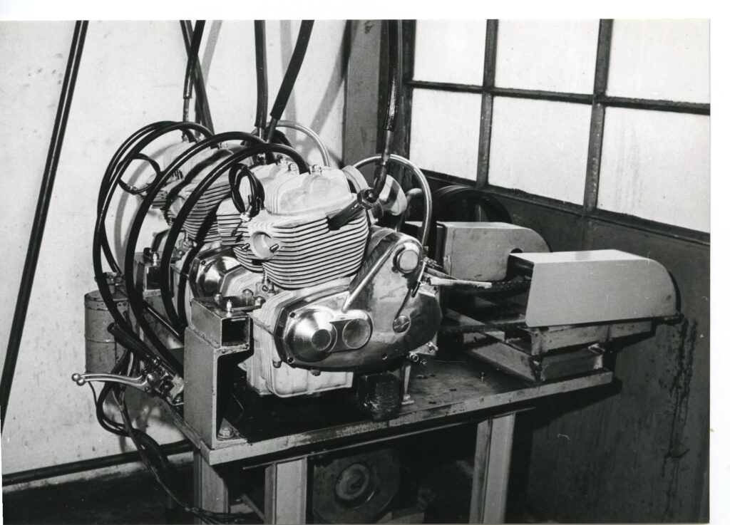 Au banc à l’usine en 1972. Le moteur tourne sans carbus ni échappements -