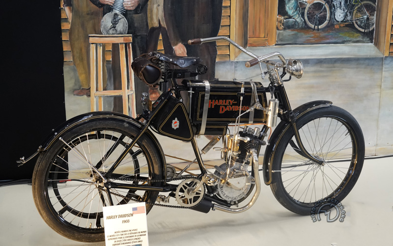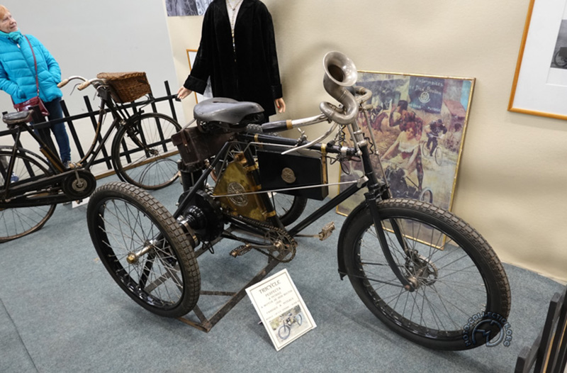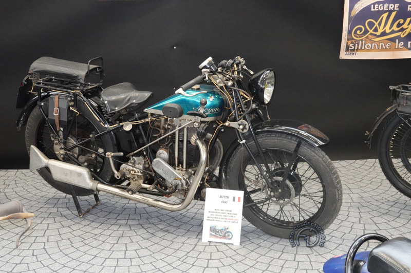 Une des rares ancêtres du salon, la Alcyon 250 Moto légère de 1910 avec sa curieuse fourche dont les bras controlés par un ressort, se plient en leur mileu.