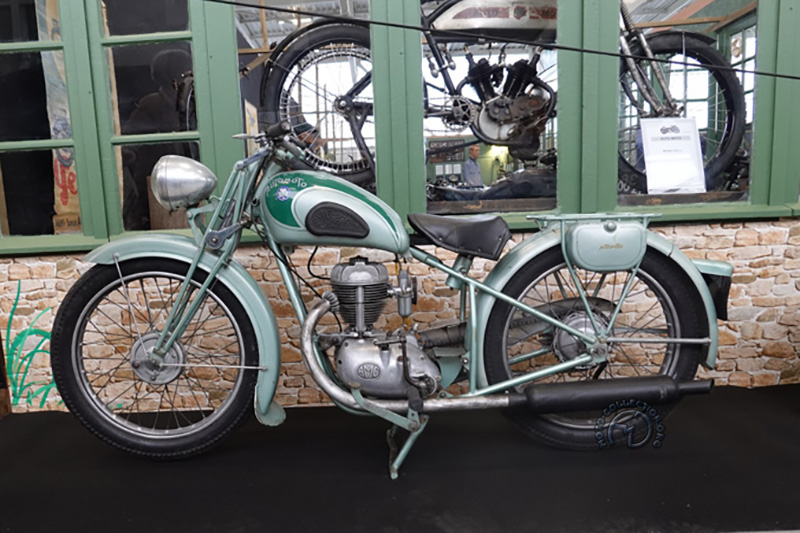 Les routières étaient représentées par deux motos, dont cette M 200 de 1953, plus vieille moto de l’exposition Maico. Ce modèle a existé aussi en 125, 150 et 175 cm3, et la motorisation donnera naissance à la 250 Blizzard quelque années plus tard, puis aux premières vraies motos de tout-terrain