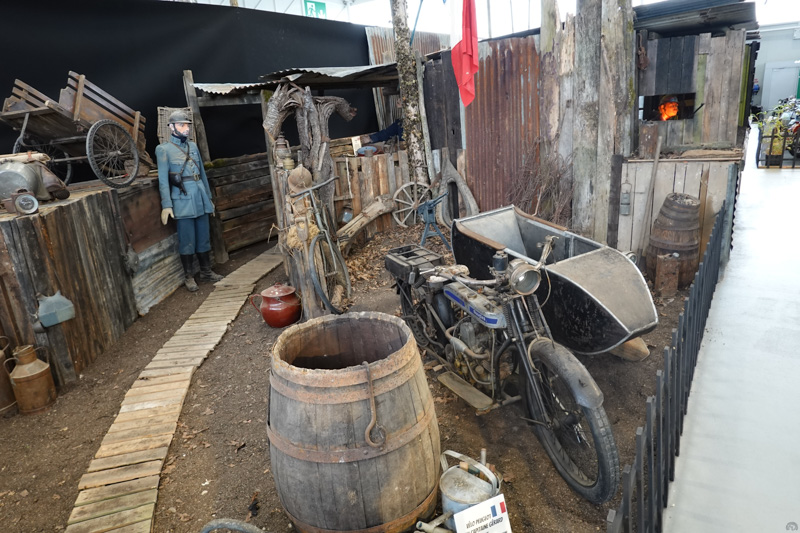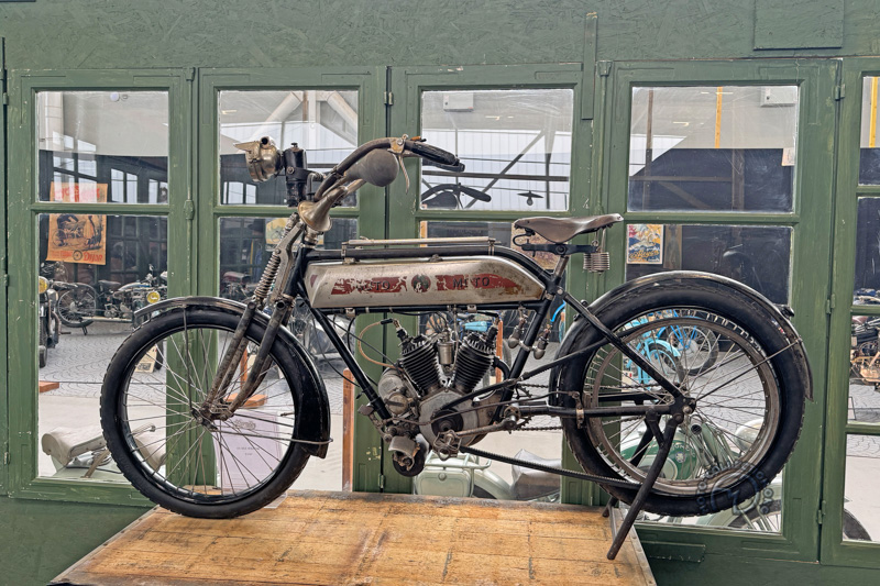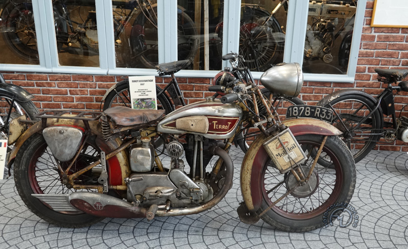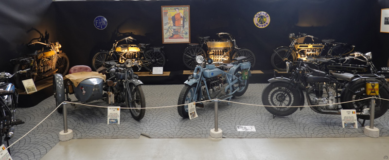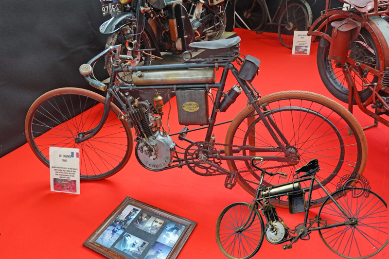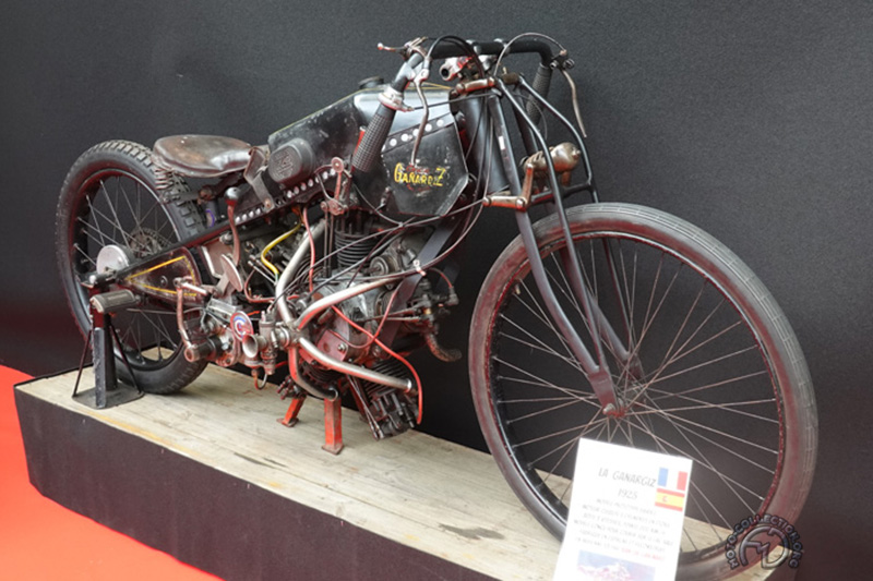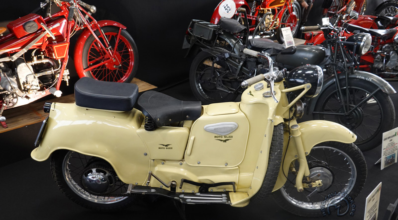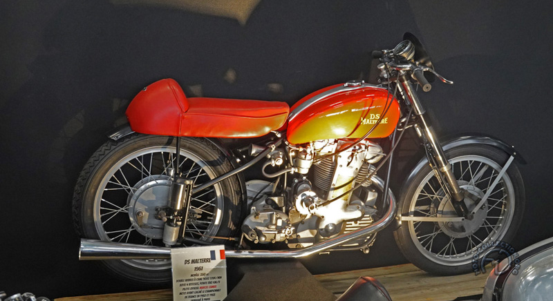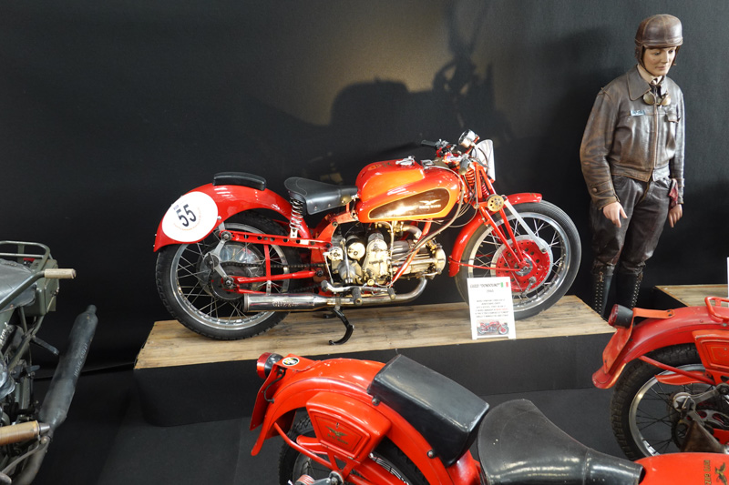 Une originale exposition sur les différents types de fourches proposées par les constructeurs au fil du temps nous permet d’admirer ce Motom 98 TS de 1953 dont les bras oscillants avant et arrière sont contrôlés par des barres de torsion.