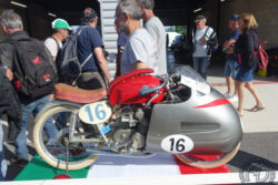 Les collectionneurs de belles Italiennes anciennes sont toujours en majorité dans les stands de la pit lane. Ici une Gilera 500 Saturno Corsa de 1956.