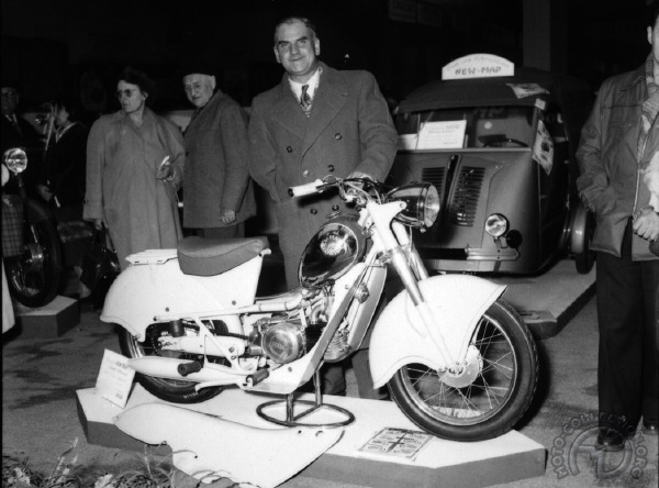 Le Jonghi Polo (ici au salon de 1955) bénéficie d'un moteur maison spécifique et reprend la fourche maison à roue tirée.