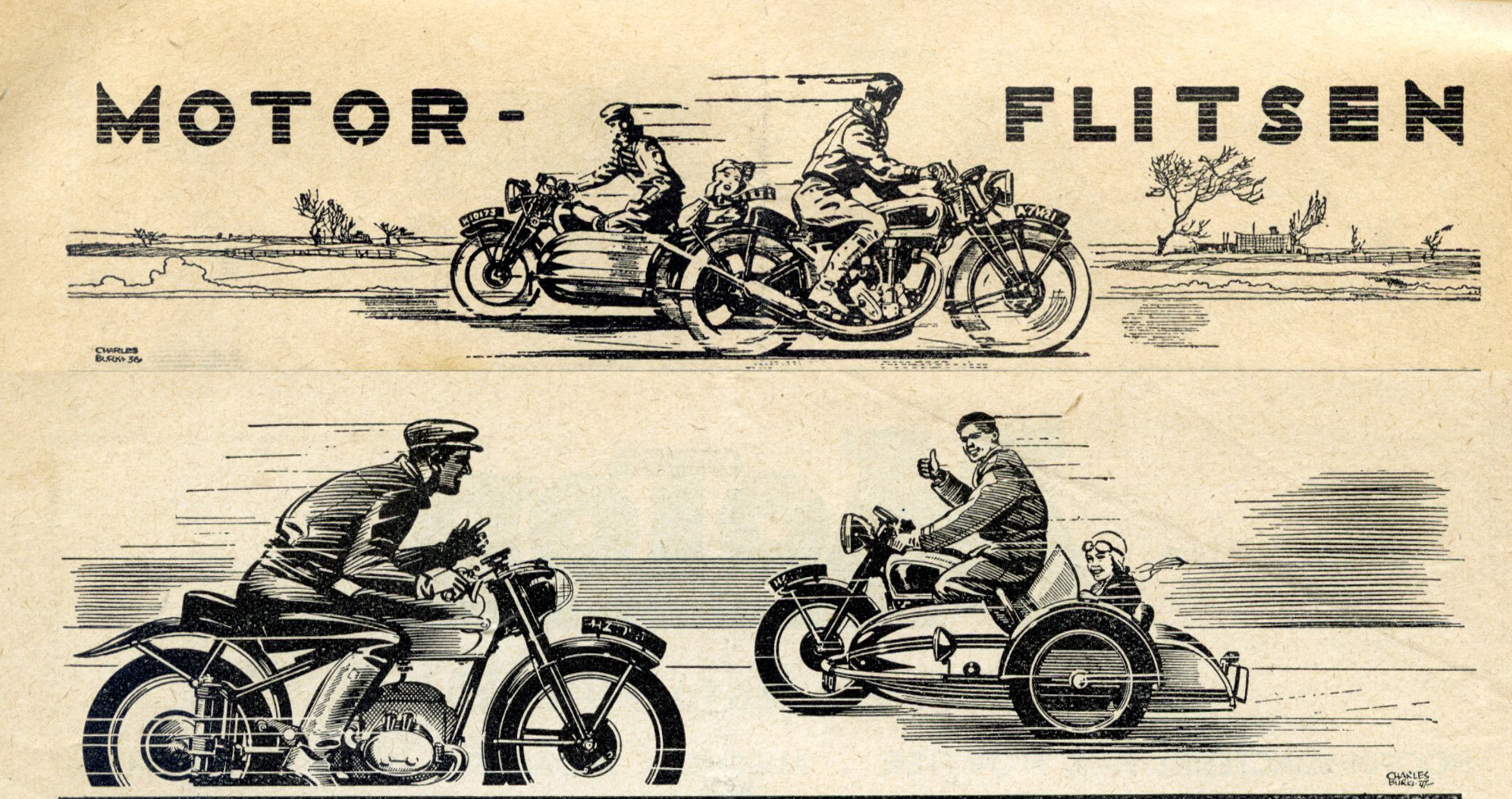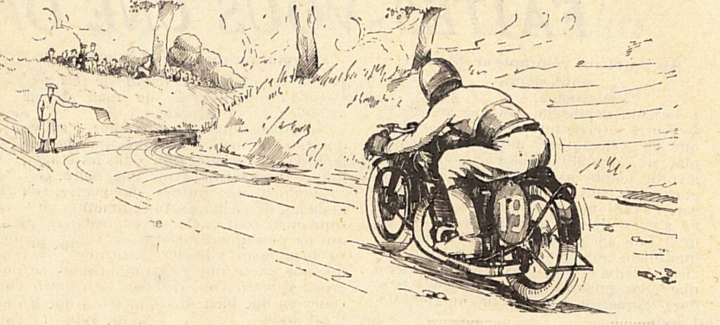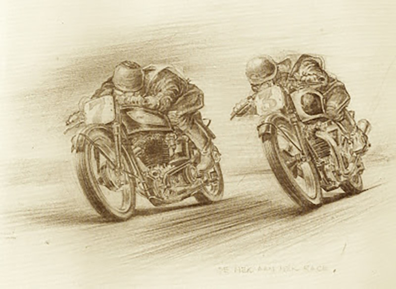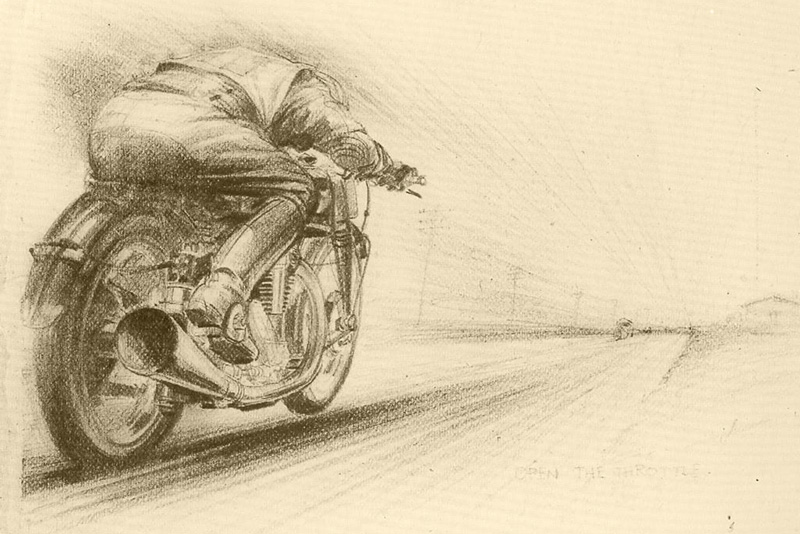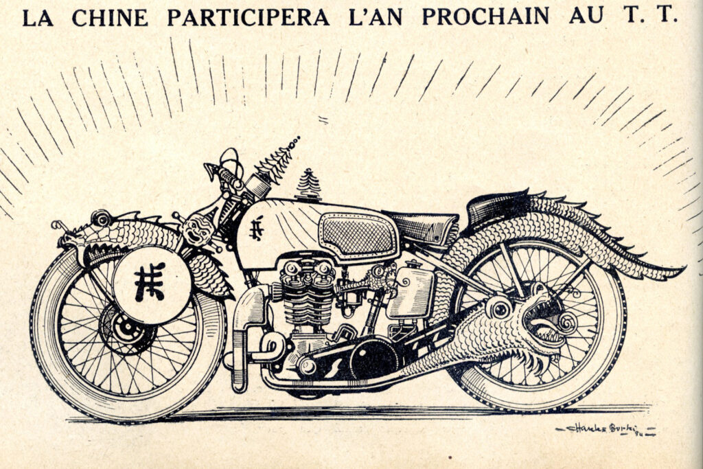 Charles Burki s’installe aux Pays-Bas en 1929 pour étudier l’architecture à Delft et se passionne pour les courses de motos, notamment le Tourist Trophy d’Assen. Ses croquis de course sont remarquables, il y montre les différents styles de pilotage et, bien sûr, les détails de leurs montures, dans l’âge d’or des courses des années 1930. En 1932, il part pour Paris afin d’étudier à l’École des Beaux-Arts, où il reste trois ans, signant au passage de nombreux dessins dans Moto Revue auquel il contribue très régulièrement. Parmi ses illustrations figurent ces spectaculaires études de 1932 censées préfigurer l’avenir avec des motos de course profilées et fantastiques, pour un article traitant de la nécessité de fendre l’air efficacement, plutôt que de simplement augmenter la puissance pour lutter contre l’atmosphère.