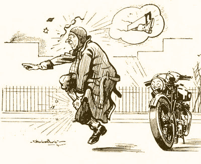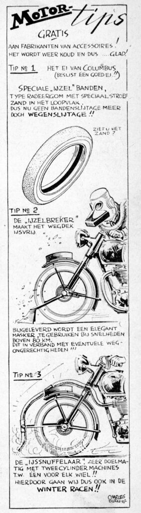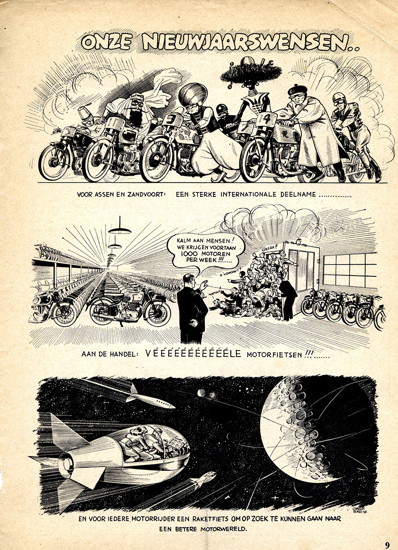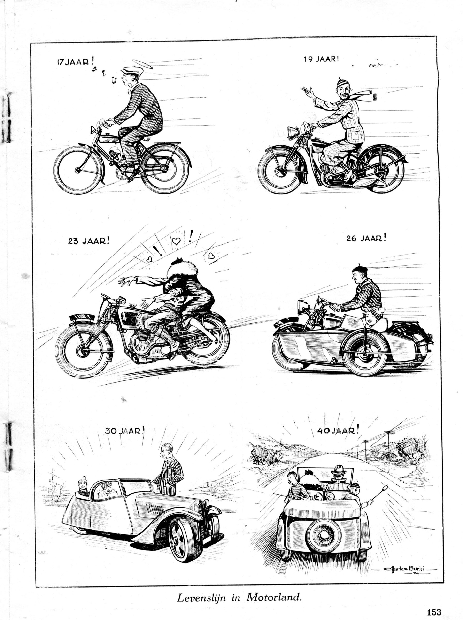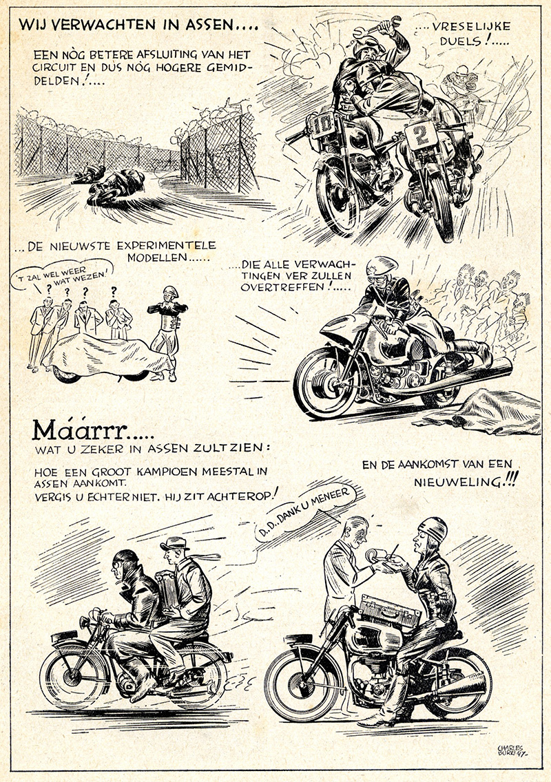 Si, en France, nous avons eu Géo Ham, Daniel Rebour et quelques autres, les Pays-Bas ne sont pas en reste avec Charles Burki, un illustrateur néerlandais, passionné de motos qui deviendra designer avec le 50 Boomerang construit par Union en 1961. Ses dessins sont souvent sur le mode humoristique, mais penchez-vous sur les détails des motos et vous découvrirez que ces oeuvres sont celles d’un vrai connaisseur.