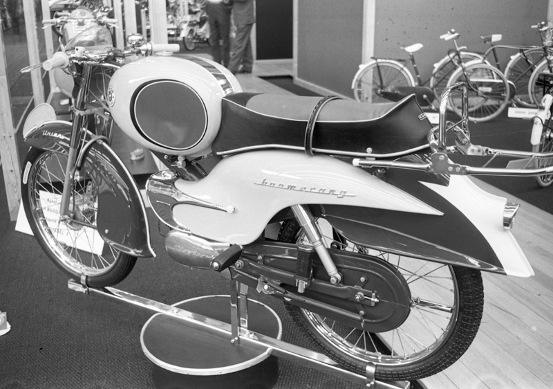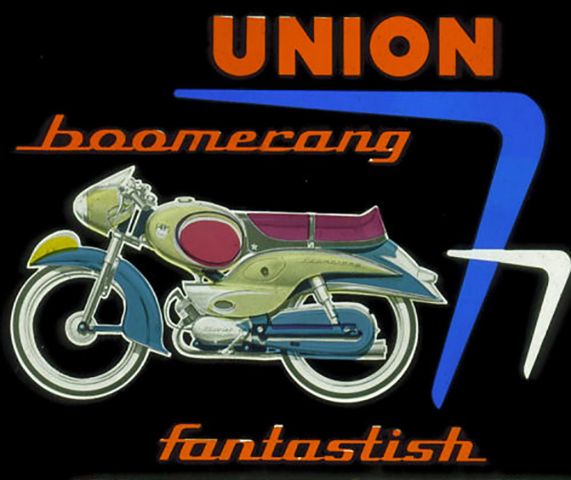 En 1960, la grande marque de 50 cm3 Union lui confie le dessin d’un nouveau cyclomoteur sportif équipé du rare moteur néerlandais Plumier. Burki s’acquitte de cette tâche avec un grand talent et crée le Boomerang doté d’un style et de couleurs aussi étonnants que novateurs. Hélas, était-ce du à son modernisme trop avancé, à son moteur trop poussif, ou à son prix trop élevé, le Boomerang ne connut pas le succès mérité. Charles Burki nous a quittés en 1994.