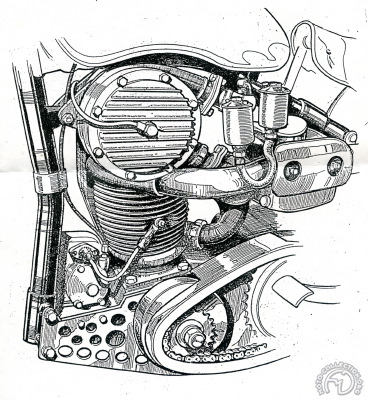 De 1932 à 1934, Imperia qui a remporté huit titres de champion d’Allemagne en vitesse et en courses de côte en solo comme en side-car, veut passer à la vitesse supérieure. L’ingénieur Rolf Schröter, propriétaire de la marque, conçoit alors l’ambitieux projet d’un deux-temps à pistons opposés de 346 cm3. Le haut moteur est donc surmonté d’un second vilebrequin entraîné par chaîne depuis le « vilebrequin » du bas moteur et les deux pistons se meuvent à la rencontre l’un de l’autre (Alésage : 57 mm, Course 2 x 68 mm ) avec un taux de compression de 12 à 1. L’allumage est assuré par une magnéto de bicylindre. Avec une alimentation à l’alcool, la puissance au banc, colossale à l’époque, est de 40 ch à 5200 tr/min. Le moteur est également testé avec un compresseur. Pas de chance, le carburant essence-alcool est interdit en Allemagne à partir de 1935 et le 350 à double piston alimenté au mélange essence huile standard surchauffe considérablement avec ce carburant et ne se révèle pas plus performant que les 350 course conventionnelles. Imperia se lance alors dans le projet encore plus fou d’un deux-temps flat twin à compresseur accouplé à une boîte de vitesses automatique. Il est même prévu que le projet se poursuive avec une version route à transmission par arbre, hélas, l’entreprise ruinée par ces coûteuses recherches, doit fermer ses portes au milieu de 1935 avant sa finalisation.