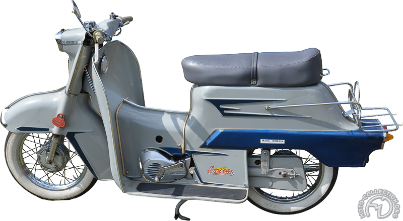 Salon d'Amsterdam en 1964 : Les jeunes rêvaient des lignes italiennes et Superia rate le coche en présentant ce lourdaud Futuramic 50 cm3 en version cyclo ou vélomoteur avec les mêmes mécaniques que le Jet. La marque précise bien dans le catalogue que le guidon est de type Harley. Ca rassure !