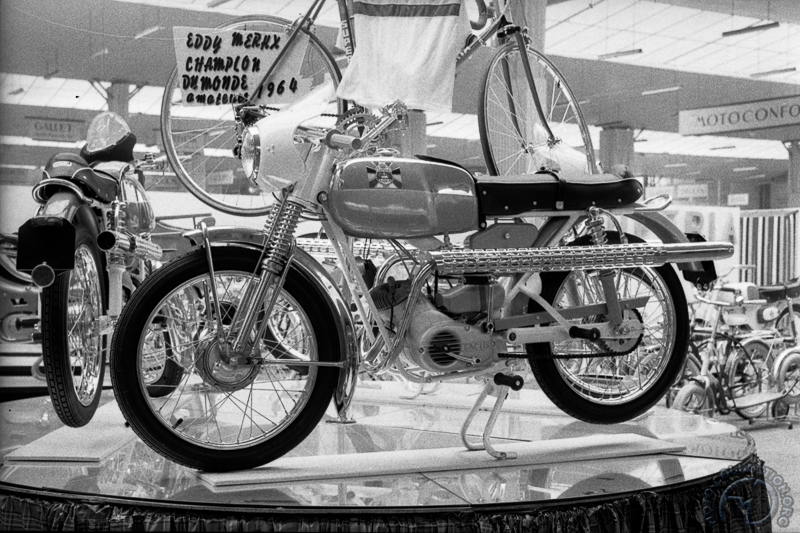 1964 : Superia arrête enfin de copier son frangin et se lance dans le scrambler avec un faux cadre double berceau et un Sachs à double échappement relevé et boite 4 vitesses. Notez, au-dessus, le vélo d'Eddy Merckx qui vient d'être sacré champion du monde pour l'écurie de la marque.