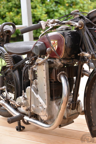 Apparue sur les premières Motobécane 500 de la série B, la culasse quatre soupapes fut brièvement utilisée sur le nouveau bloc S apparu en 1934 à commencer par cette 500 S5C Grand Sport dont la boîte, encore à 3 vitesses, est commandée au pied avec un curieux tambour de sélection déporté sur l’avant du cadre.
