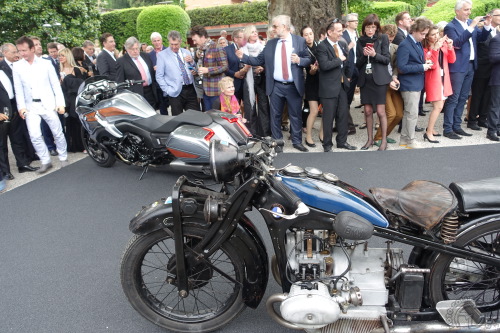 On est jamais mieux servi que par soi même et BMW, organisateur de l’évènement, en profite traditionnellement pour présenter des « concept models » sur quatre et deux roues. Deux roues, mais six cylindres avec ce projet-101 digne de figurer dans les prochains James Bond. Inspiré par le style des baggers américain, il préfigure sans aucun doute les prochaines grosses GT de la marque. Il pose ici successivement avec une remarquable 750 R16 de 1932 dans son jus d’origine et toujours vaillante et moi-même au guidon avec Stephan Schaller, le big boss de BMW Motorrad (cravate à rayures), et Edgar Heinrich, à ses côtés, qui ont l’air de bien se marrer en me voyant sur ce type d’engin qui n’est pas dans mes habitudes.